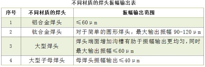 焊頭,都有額定的振幅輸出。針對不同材質的焊頭,振幅輸出各不相同,在焊接生產的過程中,要保證在焊頭額定范圍內輸出振幅,這樣才能在保證焊接效果的前提下,較小對焊頭的耗損,不使焊頭失效。不同材質的焊頭振幅輸出如表所示: