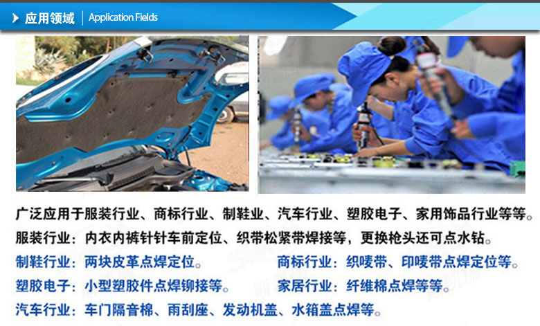 這款手提式超聲波擁有點鉆及點焊功能,適用范圍廣泛,在服裝行業、商標行業、塑膠電子、家用品行業等領域得到廣泛應用。而尤其在汽車行業中,它能夠應用于車門隔音棉、雨刮座、發動機蓋、水箱蓋等多個方面。