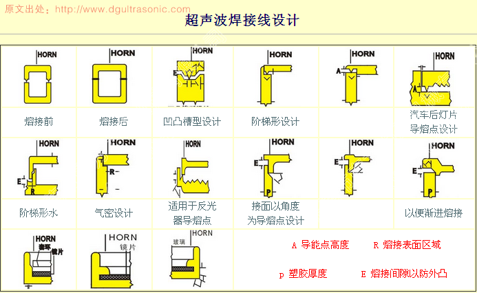 超聲線是為了便于塑膠件的超聲波焊接,而預置在塑膠上的一種尖而細的線型結構,也稱作超聲波導熔線或超聲波焊接線。其形狀多設計成等腰三角形或者半圓弧形,不過與等腰三角形截面積相同的半圓弧形超聲線,其高度比等腰三角形超聲線的高度低,在超聲波能量低時,不易出現超聲虛焊,且半圓弧形截面的超聲線能使超聲波能量均勻分配在焊接區域各部位,大限度地利用超聲波焊接機所產生的壓力和釋放的能量,既節約能源,又使超聲線熔接充分,解決塑膠件狹小空間內焊接區域各部位都牢固連接、美觀;同時,在填充料量足夠的前提下,可以節省焊接空間,非常適用于狹小的焊接空間,還可以節省超聲線設計的空間,提高單位面積設計空間的有效利用率。