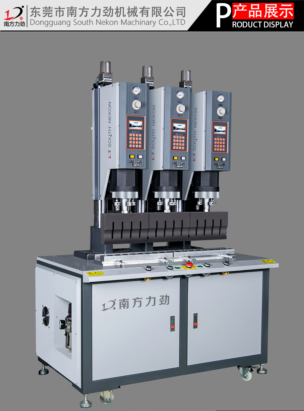 南方力勁三頭超聲波焊接機是根據客人的要求而定制的非標準超聲波焊接機